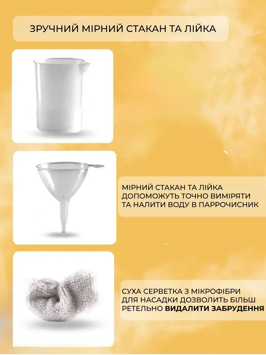 Цей набір дозволяє точно дозувати воду перед використанням пароочисника, забезпечуючи оптимальне використання парової функції.